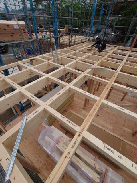 野地貼りの時に少し降ってきちゃいましたがお昼で無事に建て方完了です。